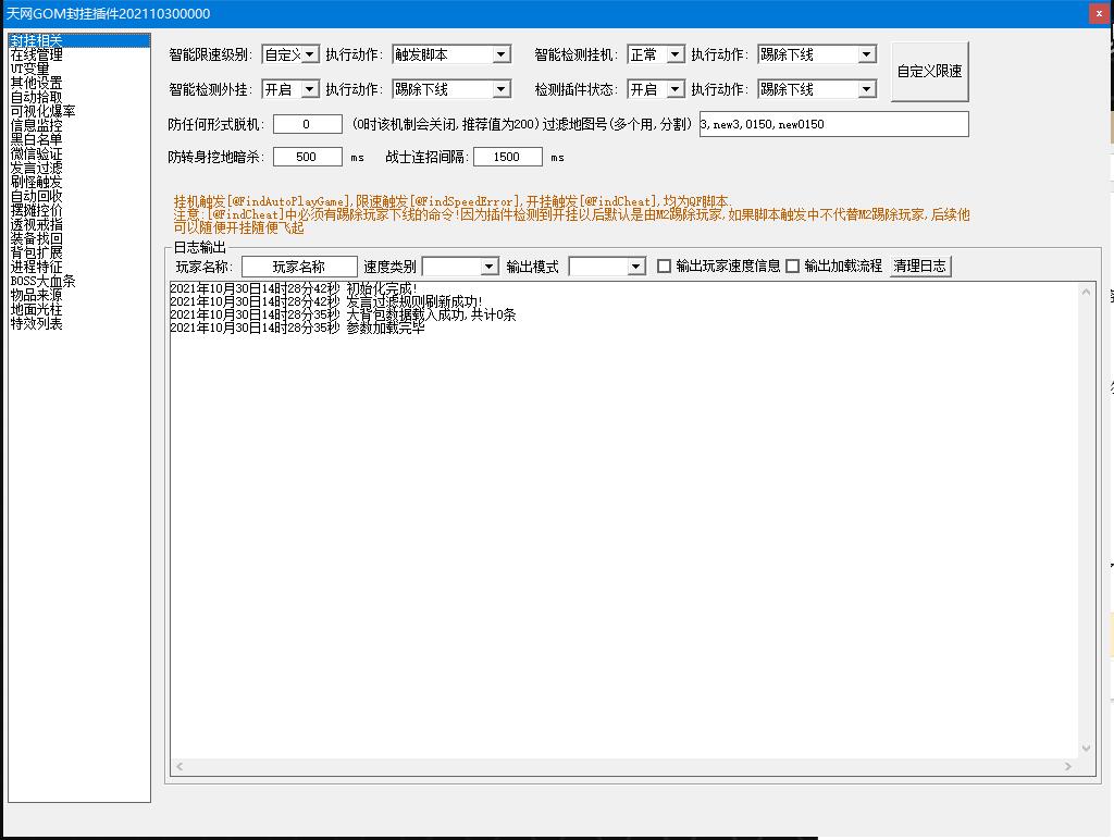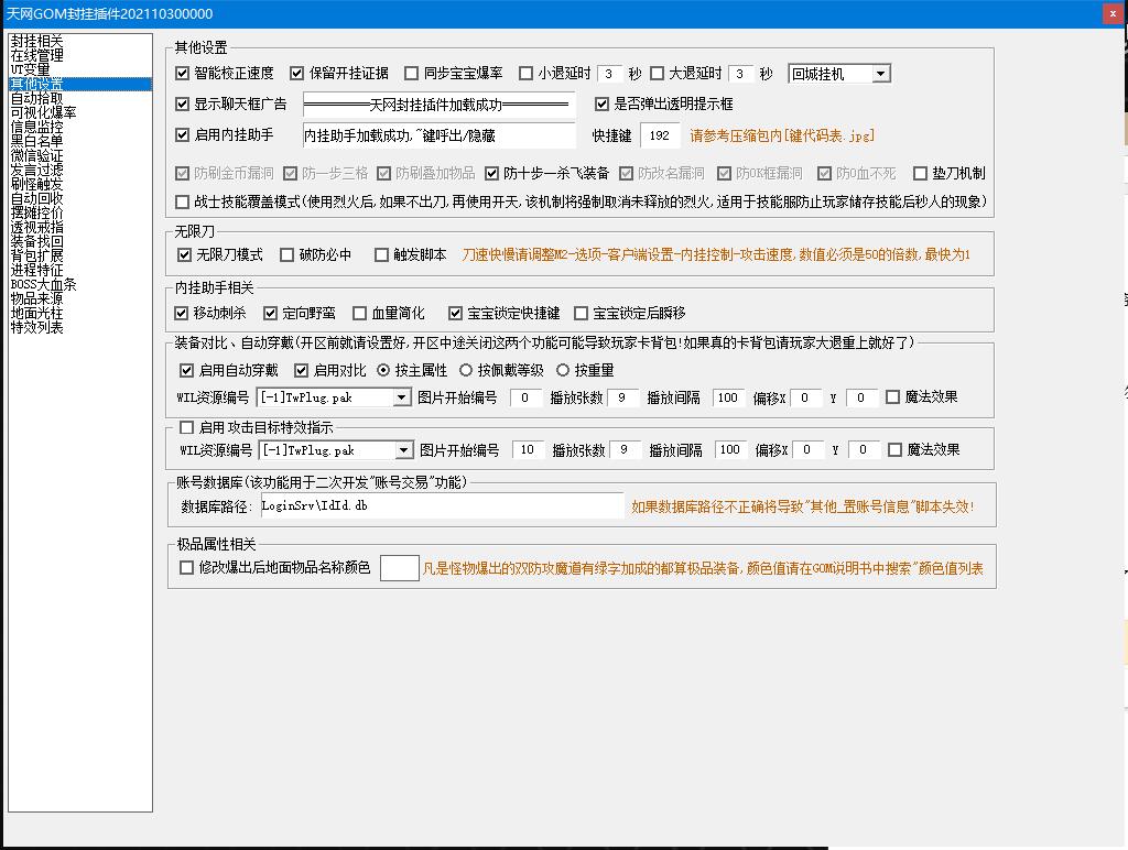 安装后,默认开启了以下功能:大背包、无限刀、血量简化、自动拾取、内挂助手、装备对比、自动穿戴、主动防御+被动检测、聊天监控。